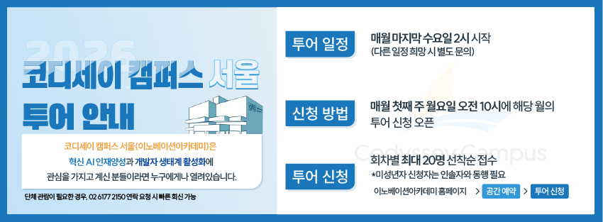 상단으로 이동 HOME 42 SEOUL 개인정보처리방침 문의 교육관련문의 : qna@innoaca.kr 제휴제안 : communication@innoaca.kr 전화문의 : 02-6177-2100 주소 서울시 강남구 개포로 416 © 2019-2024 Innovation Academy. All Rights Reserved. 사업자등록번호 : 757-82-00285 Family Site 과학기술정보통신부 서울특별시 정보통신기획평가원 코디세이 캠퍼스 42서울